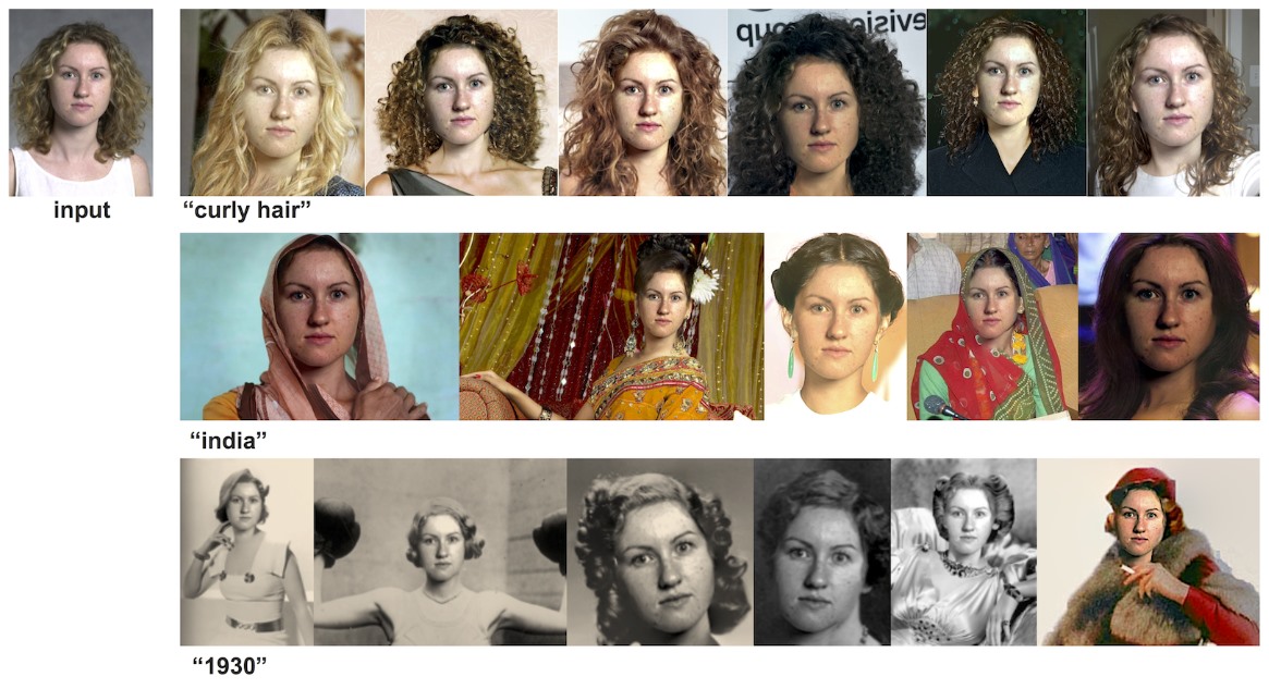 The system analyzes the picture of your face and determines how to intelligently crop it to leave nothing but your face. It then searches for images matching your search term — curly hair, for example — and looks for “doppelganger sets,” images where the subject’s face is in a similar position to your own.