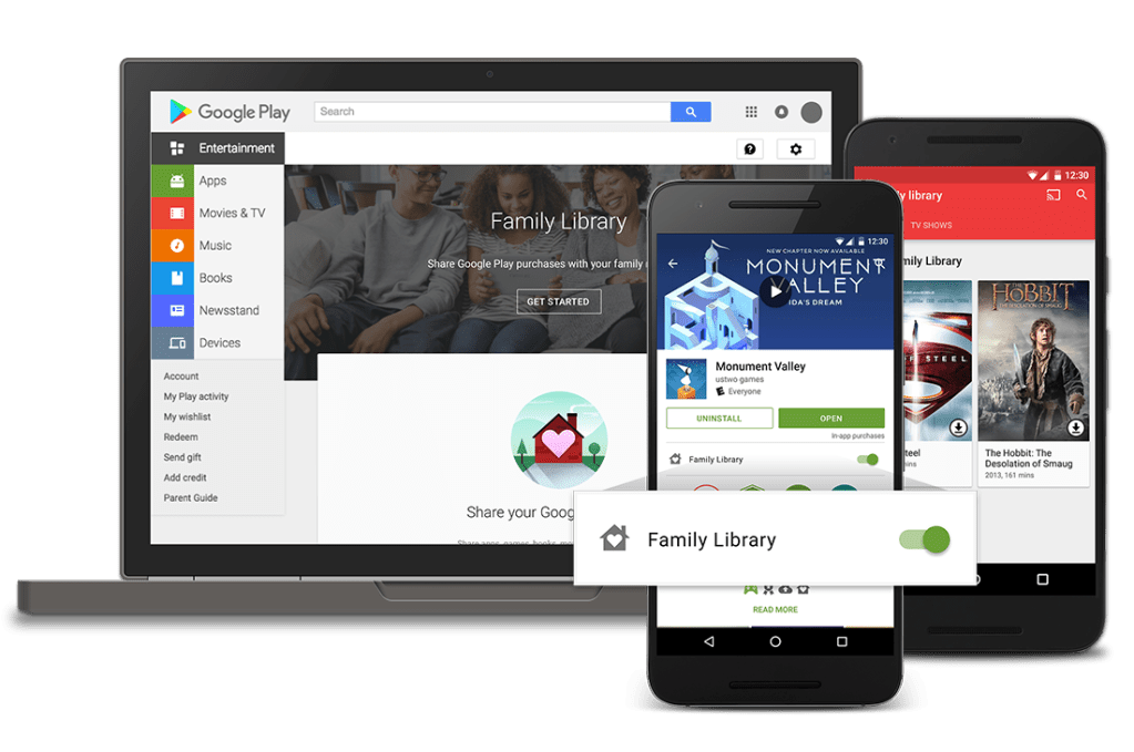 Google officially announced this morning the launch of “Family Library” – a program that allows up to six family members to share their purchases from Google Play across devices. This includes the ability to share movies, TV shows, books, apps and games across Android phones and tablets, and, in some cases, across the web, iOS, and other connected TV platforms like Roku, Android TV, Smart TVs and more.