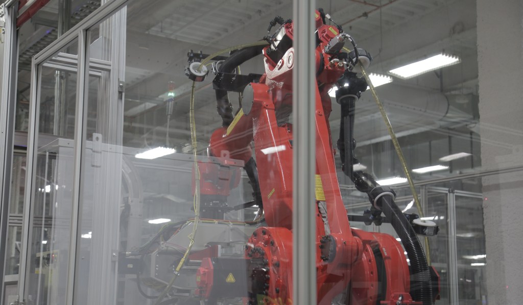One of the few machines not shrouded in secrecy: a 10′ tall robotic arm used to assemble Powerwalls