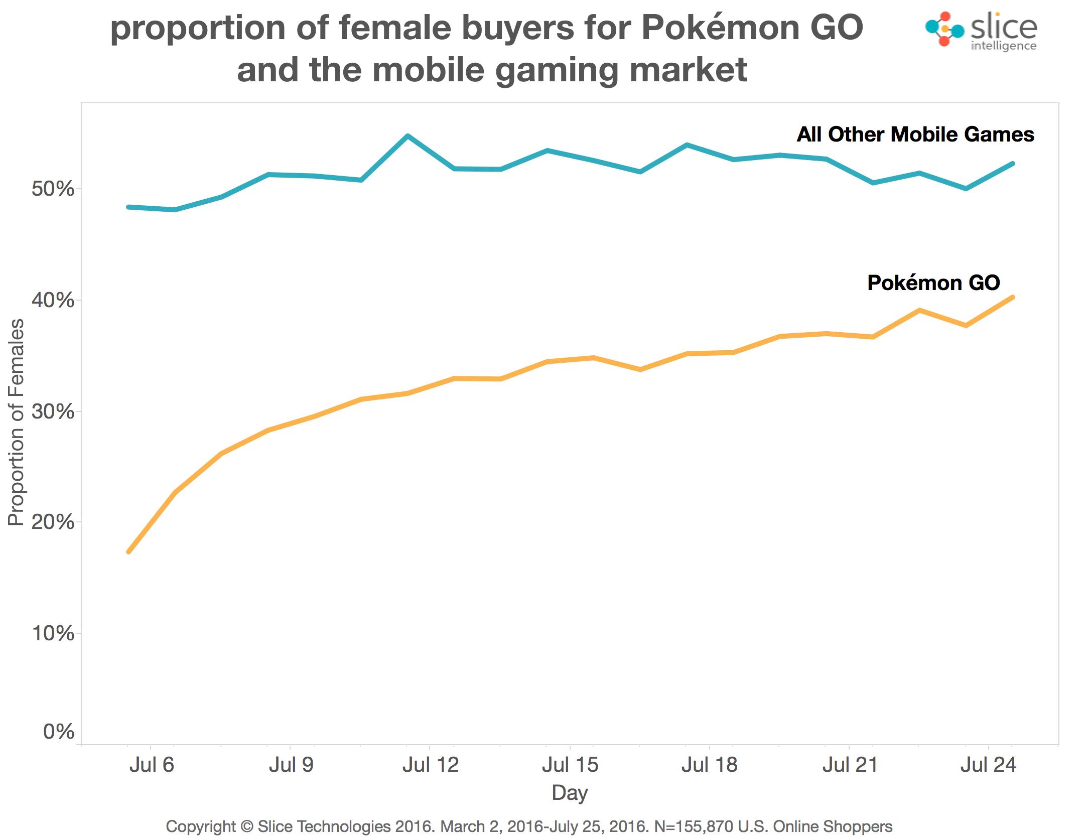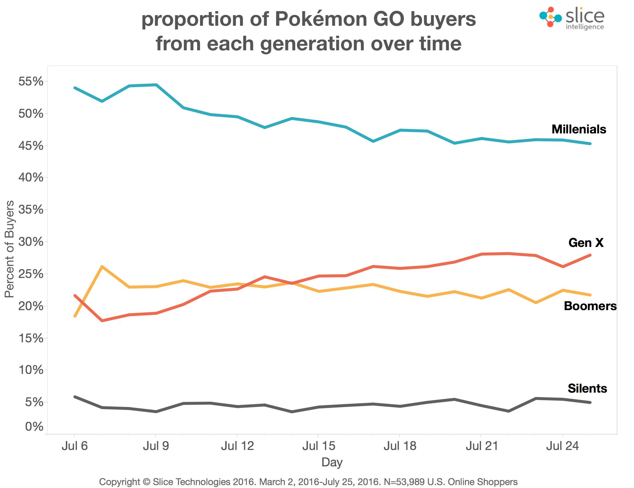 Unrelated to spending, Slice also looked at the demographics of Pokémon Go users, and discovered that its male-female split is nearly 60:40 — like the gender makeup of the total gaming population. Players are also largely millennial (now 44 percent of users), and Gen Xers (one-third are.)