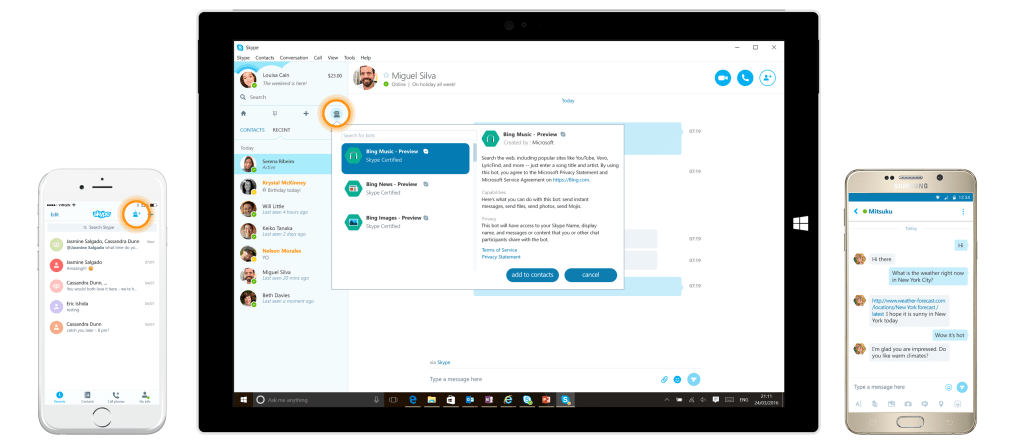 The newly announced bots are rolling out to the Skype bot directory now on Android, Windows, iOS, Mac and the web.