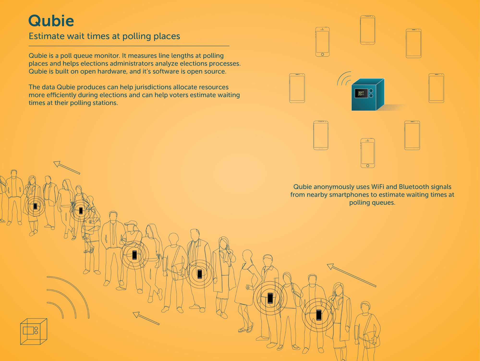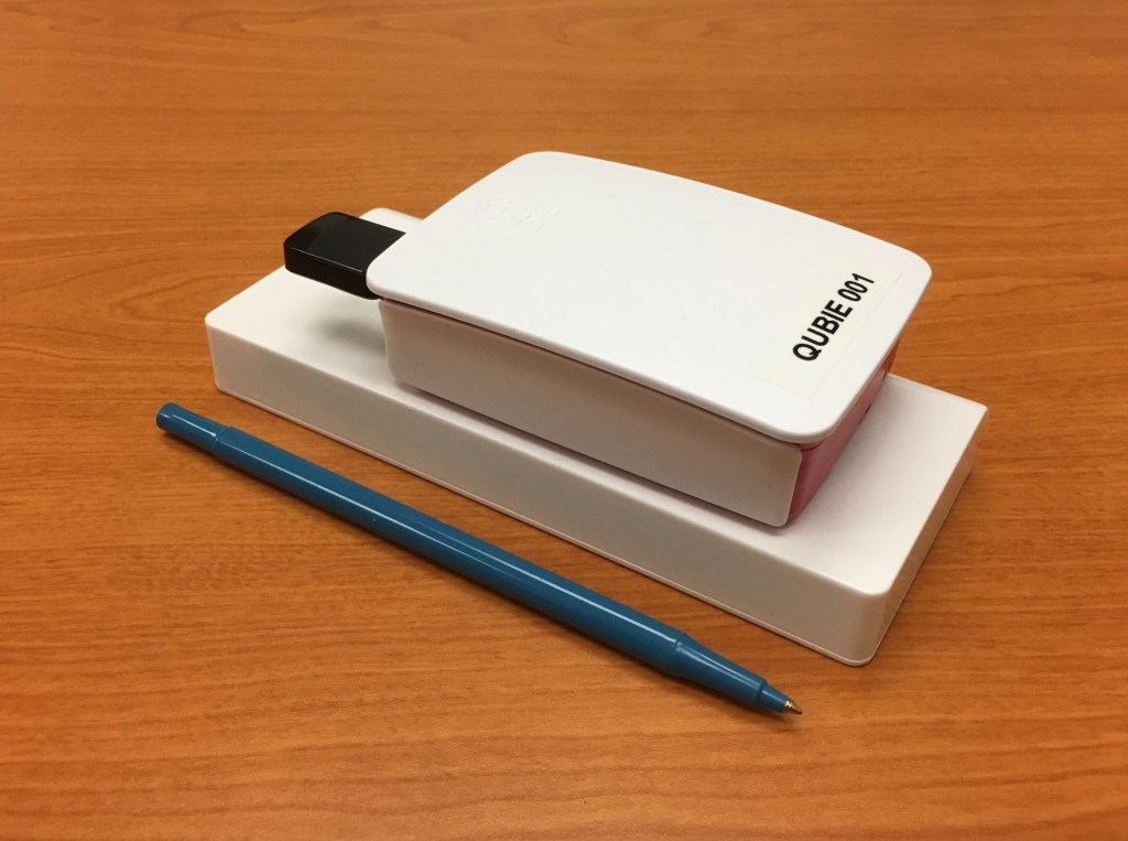 Qubie is a simple device: a Raspberry Pi with a small wireless adapter, and powered over USB or with a battery. It identifies phones from Wi-Fi signals, then monitors the time spent by the device with in range of the Qubie — boom, you’ve got a good idea of the average time it takes someone to vote at that location.