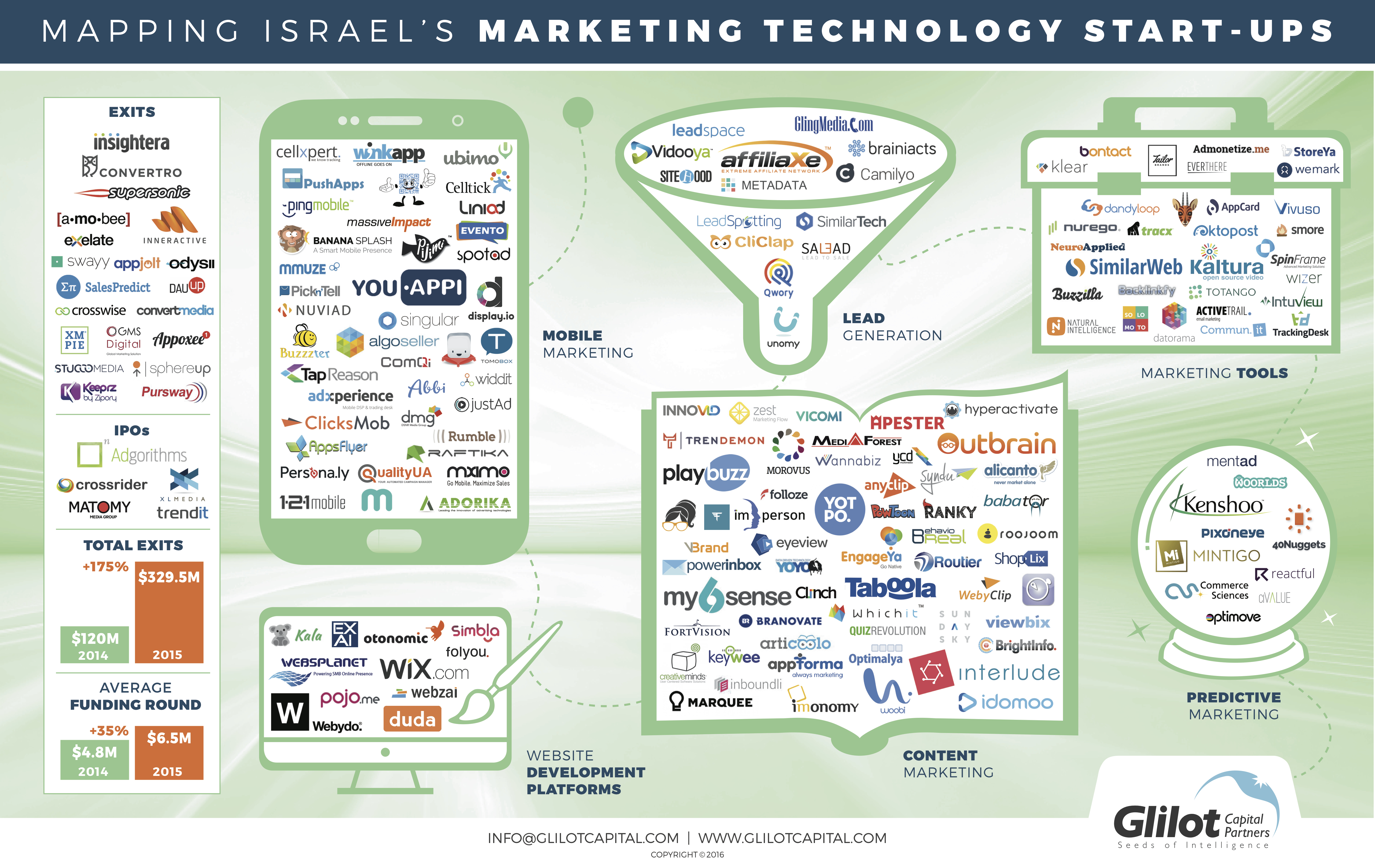 While 2015’s record Israeli marketing technology successes will be tough to replicate year in and year out, data from the current year projects 2016 to build on the success of 2015. M&A activity for 2016 is on pace to finish around $350 million, which is just above last year’s $329.5 million. In addition, total funding is projected to finish around $480 million, a $110 million increase from 2015 (Source: Start-Up Nation Central finder).