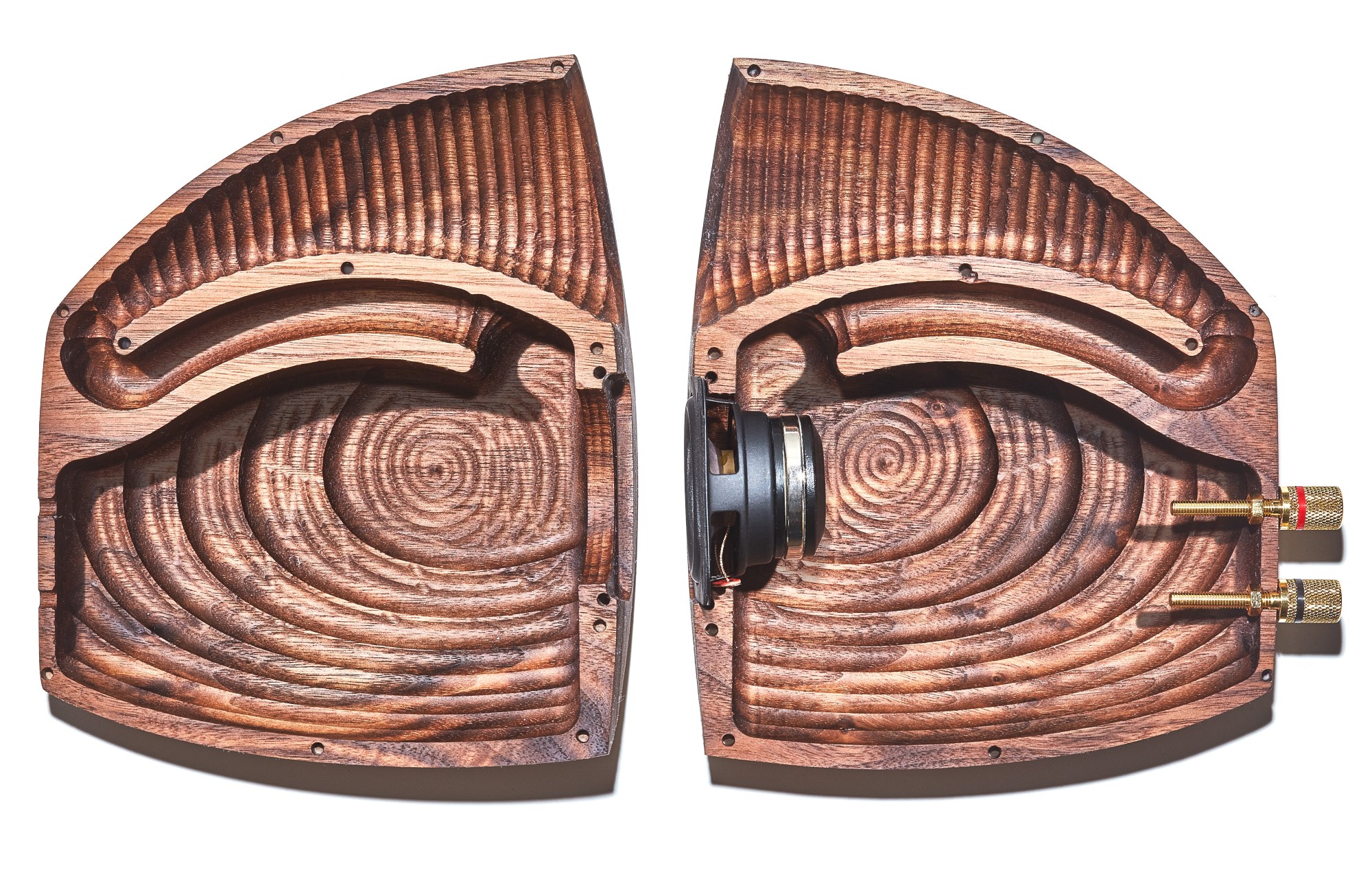 “To design the back-loaded horn, for example,” he continued — he just had to use the phrase I’d denigrated in the already written draft of this article — “I simulated an ideal horn given the driver’s parameters and enclosure size. At that point I would usually have to translate that ideal horn into a shape that could be manufactured using panels and fasteners. With Grove’s total mastery of wood CNC, the ideal horn is reproduced exactly in the enclosure.”