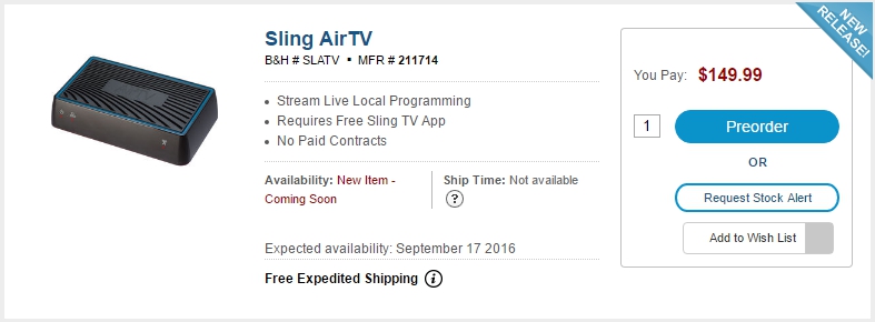 Another pulled listing on B&H Photo (top photo) confirmed the same pricing, and stated that the box was expected to become available on September 17, 2016. There’s also a listing on the slingmedia.com store page here.