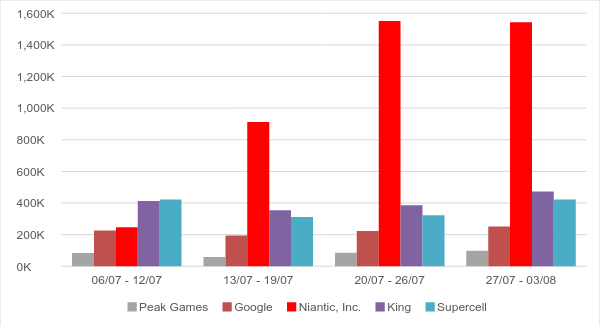 Niantic claims the crown of highest earner, of course, and initially did cause a bit of a dip in spend among the completion. But spending quickly returned to pre-Pokémon levels – and then leapt ahead, rising higher than they had been before the game’s launch.