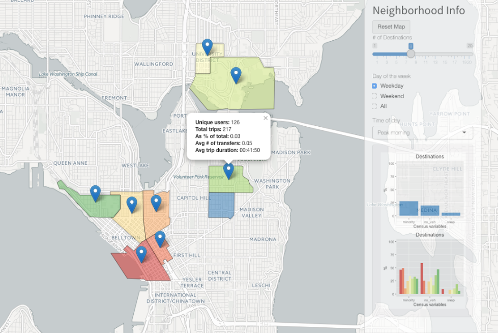 Seattle is more than a little late to the game when it comes to centralized mass transit, but the advent of ORCA (One Regional Card for All) has started tying things together nicely. The system also produces a torrent of data, very little of which is put to good use, as I understand it. The team decided to dive into this data to see what they could see.