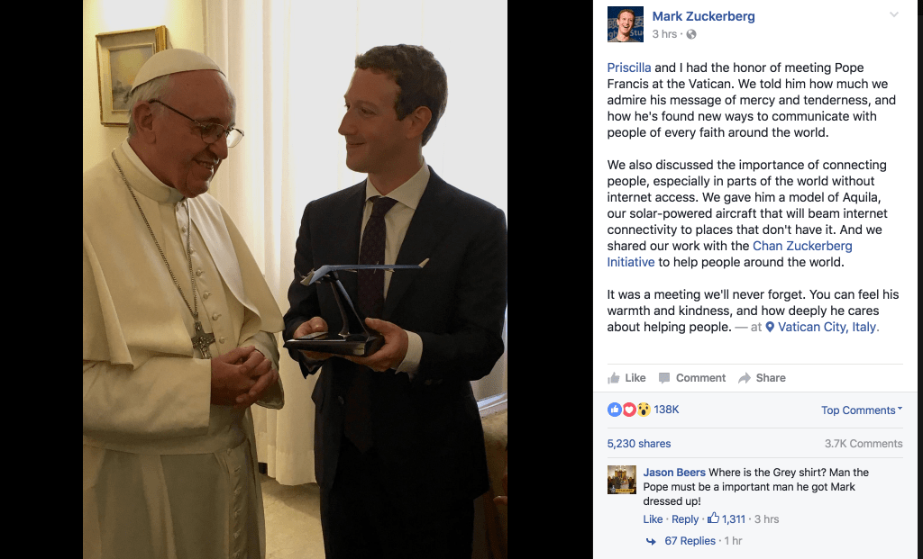 According to a post on Zuckerberg’s Facebook page, the CEO told the Pope how much he admired his message of mercy and tenderness, as well as how he’s found new ways to communicate with people of every faith around the world. (The current Pope uses social media, having followed in Benedict’s footsteps by joining Twitter, and he signed up for an Instagram account just this March.)