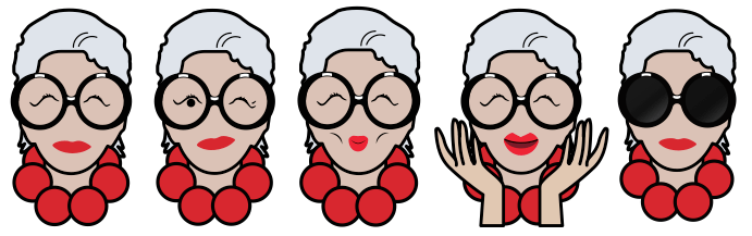 And the emojis and stickers go right along with that look. They are mostly illustrations marked by few bold colors, depicting Apfel herself in her over-sized, round eyeglasses, or the clothing and accessories she’s designed and included in her work.
