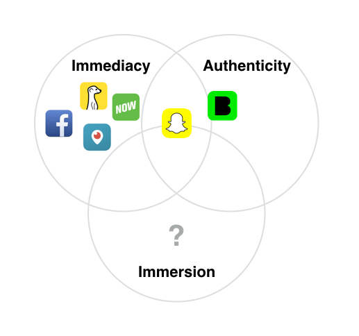 The oldest and most basic user need is immediacy, or the ability to access content in real time, which is rooted in our consumption of broadcast TV and radio media. This need helps explain the explosion of live video in the past 18 months, most notably the growth of Facebook Live and Live.ly. When people think about mobile video, they often start and stop at immediacy. As a result, immediacy features are often overvalued, in some cases to the detriment of usability. For example, Meerkat’s lack of playback greatly limited engagement on the platform.