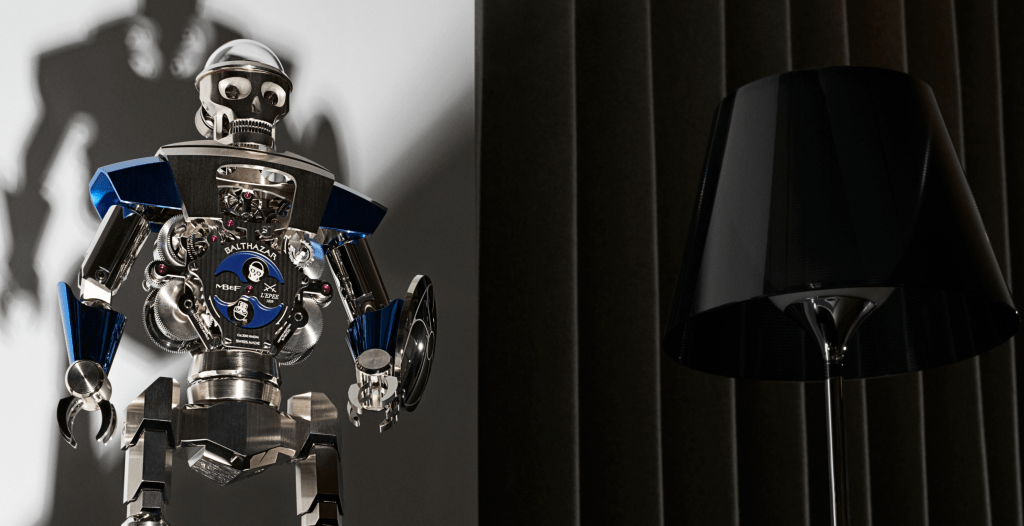 Today in Part 23 of our series entitled Goofy Rich-Person Gadgetry, we present the MB&F Balthazar, a posable robot that tells the time and has a “dark side.” First, a little context. This is basically a “novelty” designed by a watchmaker to sell to rich people. It’s entirely hand made and features an exposed mechanism and dual dials that tell the time.