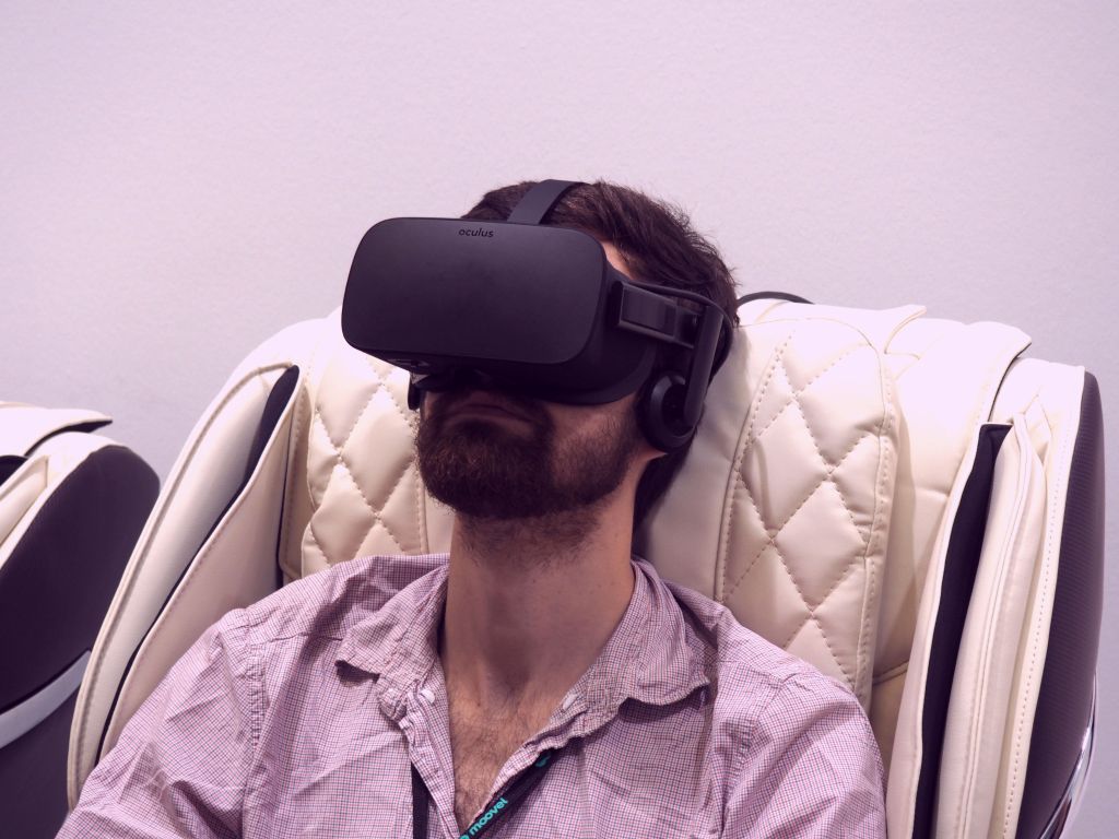 S/he walks behind you, though you couldn’t check if you wanted to — you’re seated in one of those big, expensive Sharper Image-style massage chairs. And besides, you’re straining yourself for calm. S/he tells you to breathe. Breathe. In and out. How much stress have you had in your life that you’ve completely forgotten to breathe? Life is strange. Not necessary VR-in-a-massage-chair-on-a-German-convention-center-floor strange, but strange nonetheless.