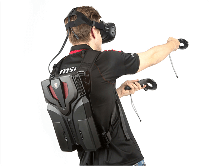 MSI rates the backpack’s two on-board batteries at 1.5 hours of gameplay, which is infinitely extendable by way of hot swapping technology (with a series of lights that indicated it’s time to switch out). The VR One features a GeForce GTX 1 graphics card, an HDMI port, Mini DisplayPort, Thunderbolt3, nine heat pipes and a slew of vents, because a gaming PC attached to the human body is a recipe for overheating.