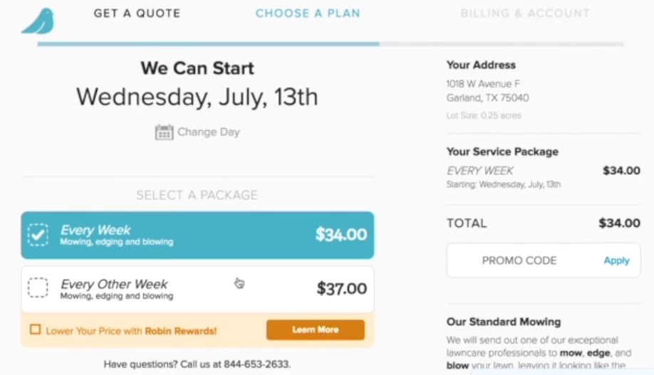 Onboarding is simple: You put in your address and a quote is generated automatically from a database of property records, from which Robin estimates lawn size. You pick a start date and recurring times, and any extras like edging or weeding, then check out. Boom, you’re done. No on-site visits, no callbacks, no wrangling a payment method that works when you’re gone — like the inevitable check left under the doormat.