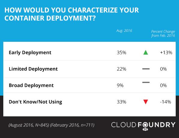 Few enterprises — if any — are currently using Cloud Foundry (or containers in general) at this scale. As anybody who has talked to enterprise developers recently can tell you, though, enterprise adoption of containers is growing quickly (and maybe faster than most people realize). Cloud Foundry’s own research shows that many enterprises are now evaluation containers, even as the number of broad container deployments has remained steady (and low) over the last few months.