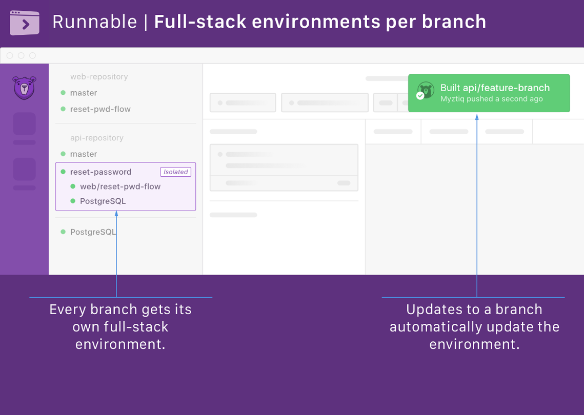 To bypass this bottleneck, Runnable creates an on-demand environment for every code change or branch on GitHub that features a full-stack environment with the complete application. Runnable spins these environments up on AWS and the whole process usually just takes half a minute or so.