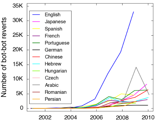 The simplicity of their functions means they have no real insight into what they’re doing, and a pair of bots may routinely undo the other’s work for years, producing no net change whatsoever and effectively canceling each other out. Humans, on the other hand, tend to have a mission, and rather than mutual reversion, one human will change hundreds of instances of another’s work with little or no response from them.
