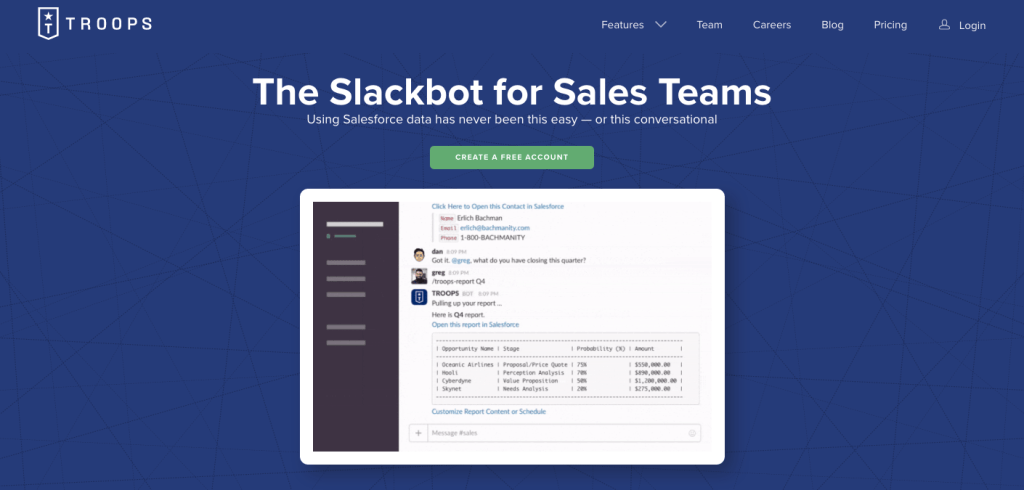Troops’ platform and bot (the products of a stealthy til now company) are now freely available to use. The company has a bot-based service that integrates with Salesforce to make it easier for sales teams to configure intelligence and enter it into Salesforce’s arcane system.