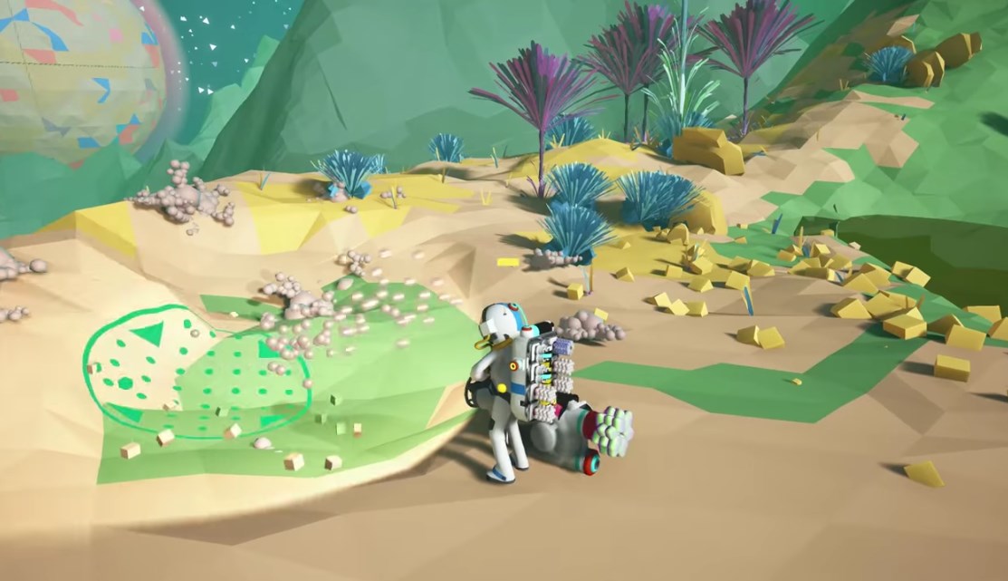 “We use what you might call ‘soft’ voxels,” Liechty explained. “In Minecraft you would never be able to create spherical planets because the game world is aligned on a grid where the top face of the cube always points at the sky. Soft voxels make it so the player can dig through the terrain or make a flat surface no matter where they are on the planet. Our analogy is that while Minecraft is like Lego, Astroneer is like Play-Doh.”