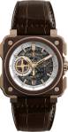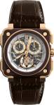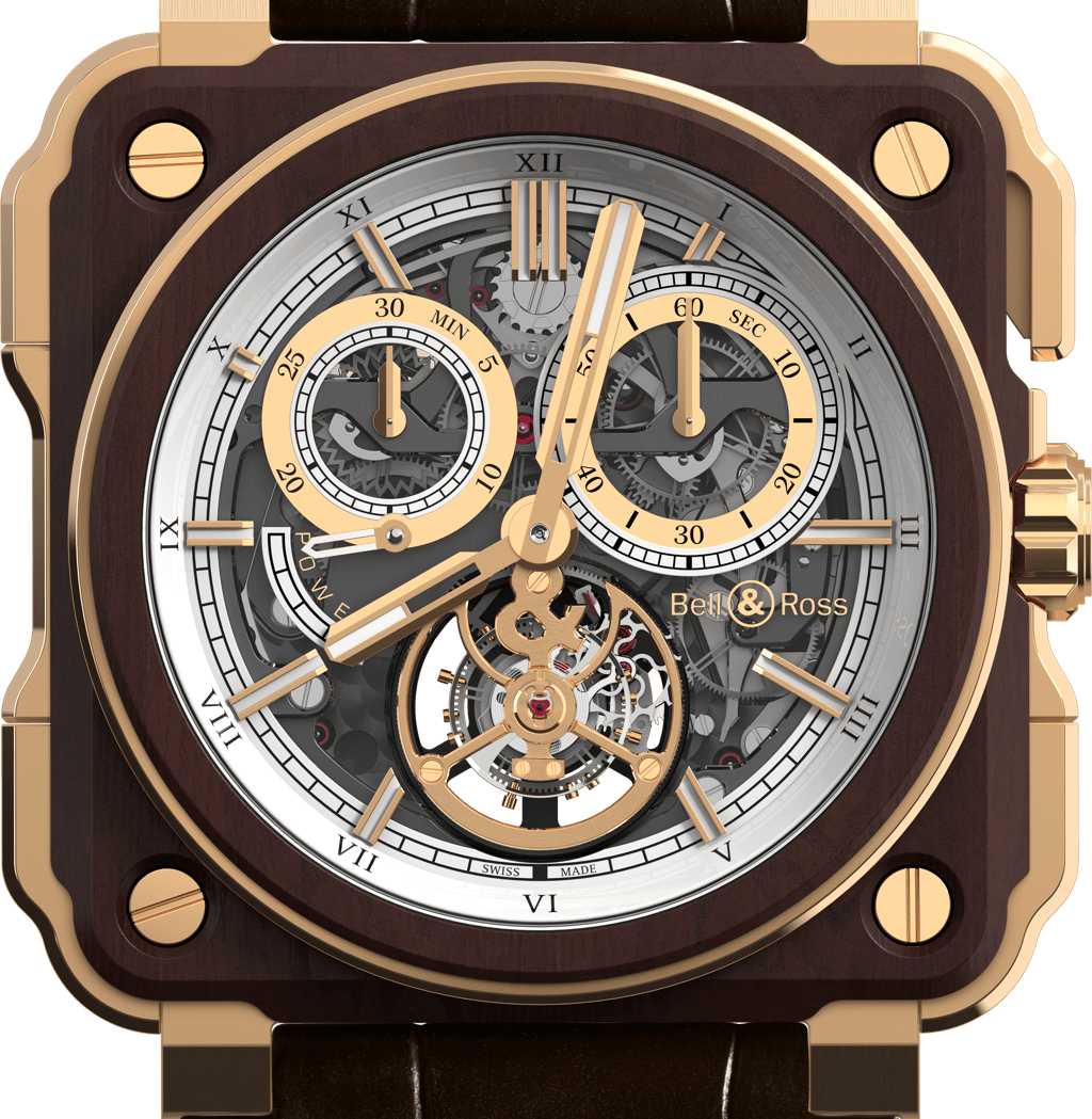 The BR-X1 is a chronograph – basically a stopwatch – with a skeletonized face and an 18-karat rose gold and wood case. The movement has a 100-hour power reserve – you have to wind it once every four days – and the Tourbillon edition has a a rotating escape wheel – the little wheel that spins back and forth on the movement – consisting of “282 minuscule constituent parts.”