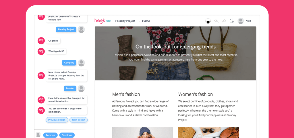 A startup called Heek wants to make building websites as simple as chatting over text and answering a few questions. Using a conversational interface, the bot asks you questions about yourself, your business and your site, then lets you click to see different designs you can customize to meet your needs. The bot will even prompt you to save your work, as you get further into the site creation process.