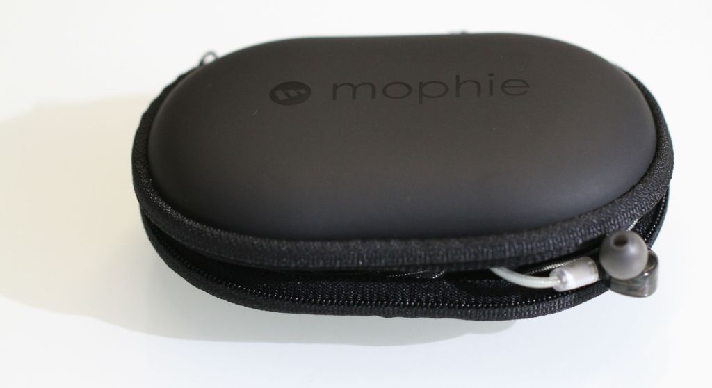 On the bottom is a microUSB slot for charging the case, along with a four-light battery level indicator. Inside is a full-size USB port. Plug a small cord in (bundled with the system for an added fee — or you can just use your own) and boom, you can start charging your Bluetooth headphones on the go. Mophie rates the charge at around 60 hours — though that number is obviously entirely dependent on the brand.