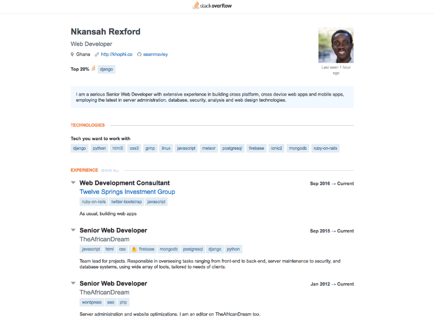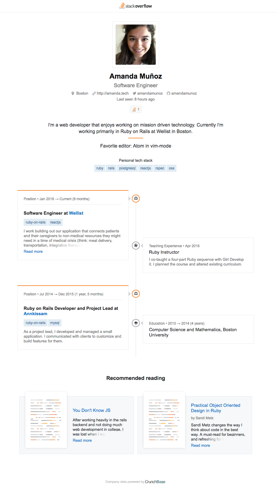 As Stack Overflow VP of Community Product Jay Hanlon told me, in working with potential employers, the team realized that regular resumes put their emphasis on job titles, schools and degrees — but that doesn’t always work for developers. According to Stack Overflow’s latest survey, the majority of developers don’t have degrees in computer science, for example.