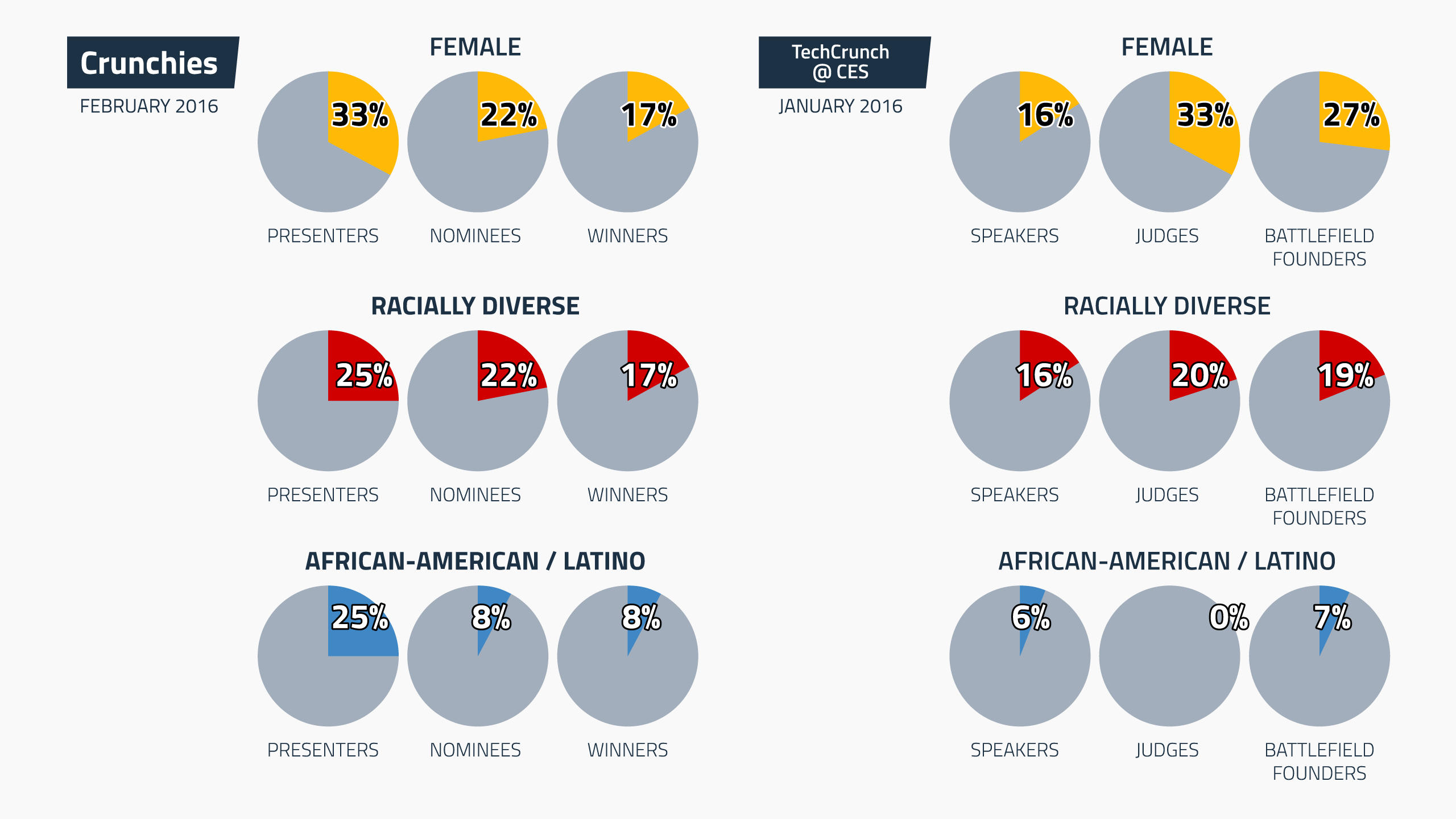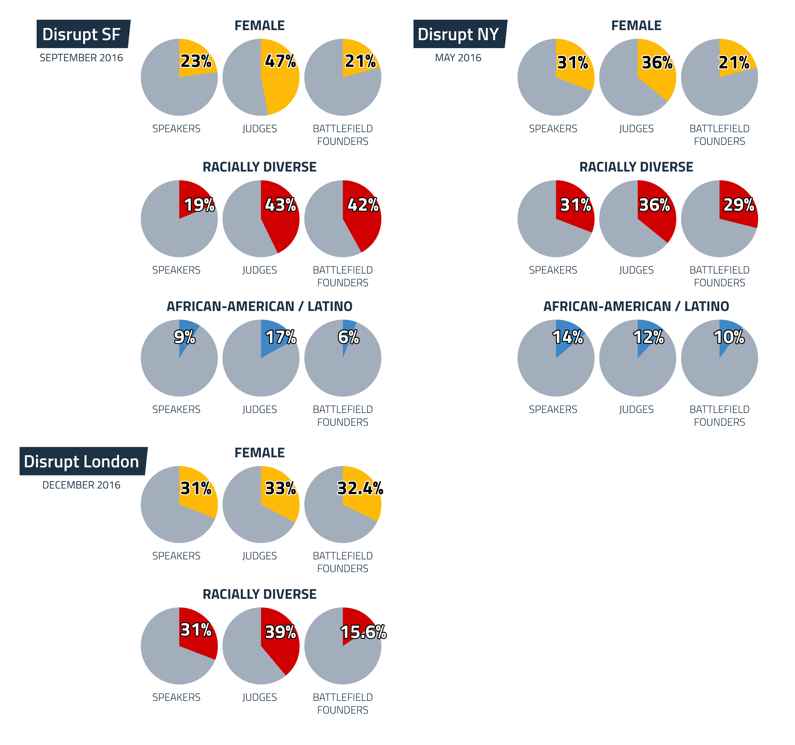 At our major events in 2016 — the CES awards in January, the Crunchies in February, TechCrunch Disrupt NY in May and TechCrunch Disrupt SF in September and TechCrunch Disrupt SF in December — we tracked the diversity of speakers, Startup Battlefield contestants and judges.
