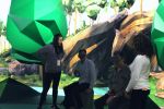 Text on the entry wall welcomes visitors to its “little corner shop.” To its right, an automated sculpture spins cardboard modules that alternately spell out the company’s name and display brightly colored designs in keeping with the Made by Google aesthetic.