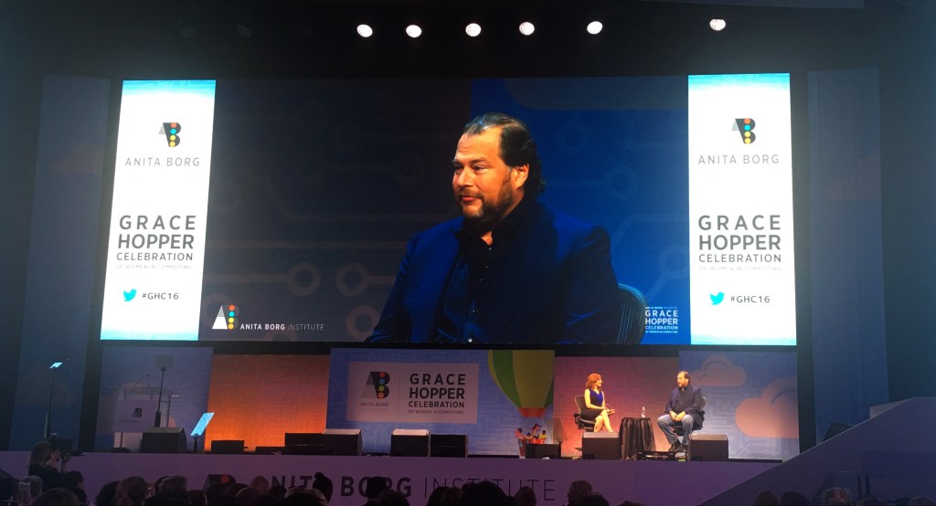 Salesforce CEO Marc Benioff took the stage at the Grace Hopper Celebration of Women in Computing today to talk about diversity and equality. This comes just weeks after Salesforce brought on board Tony Prophet, its first-ever Chief Equality Officer. Equality, Benioff said, has to be something that Salesforce stands for, just like it stands for growth, innovation, new ideas and creating new technology.