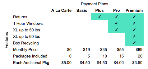 The new payment plans go into effect in December. People who were on the original Silver and Gold unlimited parcels plan are getting nudged down to the Basic $19 per month plan, which includes 5 packages per month. The other new plans are Plus ($35 per month, which includes 10 packages at $3.50 each, with additional parcels charged at $4.50), Pro ($55 per month) and Premium ($89 per month). At the top-end plan, the company also introduces cardboard box recycling, so customers don’t have to deal with the recycling themselves.