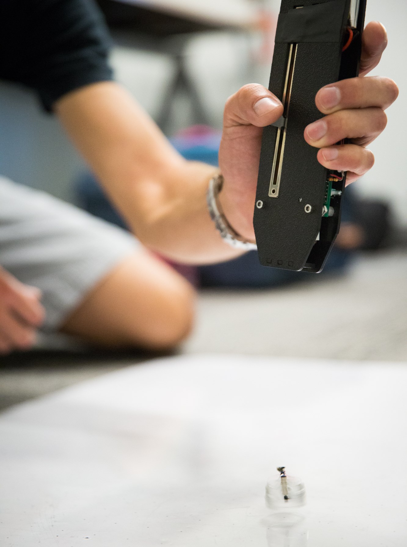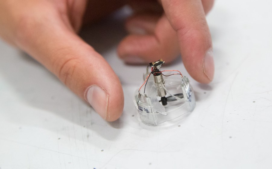 About the width of a quarter, Piccolissimo has just two moving parts, which is one more than the ballbot we saw earlier this month. One is the propeller, the other is the 3D printed body: both spin, but at different speeds. The propeller is slightly off-center, and the body turns 40 times per second, evening out the thrust to vertical — but tiny modifications to that spin speed can send it in one direction or another. It’s all controlled with a simple signal sent over an infrared beam.