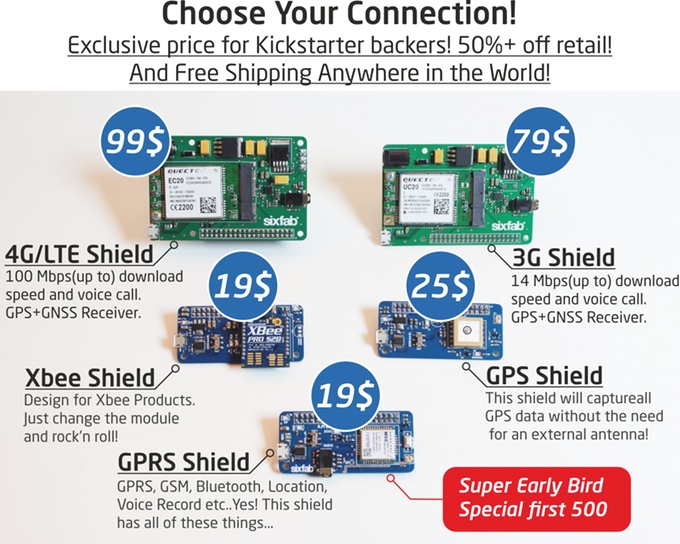 The shields — what the Raspberry Pi world calls add-on cards — start at $19 and go up to $99 for LTE/4G connectivity. The system has a unified IDE and user interface and you can start programming with the boards as soon as you connect them to your Raspberry Pi. A $19 GPRS shield adds simple connectivity — think Kindle-like — to your projects.