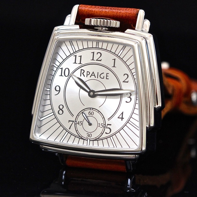 Built around a the massive Swiss ETA/Unitas 6497 movement, essentially a hand wound pocket watch movement. The watch is encased in a Chrysler Building shaped steel frame with sapphire crystal with exhibition back.