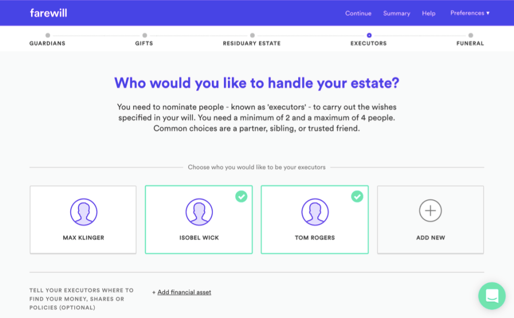 The will-writing process on Farewill is simplified by being structured as a series of questions for the user to respond to with the necessary information — with the technology taking care of the actual writing. Once the user has completed the Q&A process, and paid for the service, they can download, print and sign the drafted document (in the presence of their witnesses) to obtain a legal will.