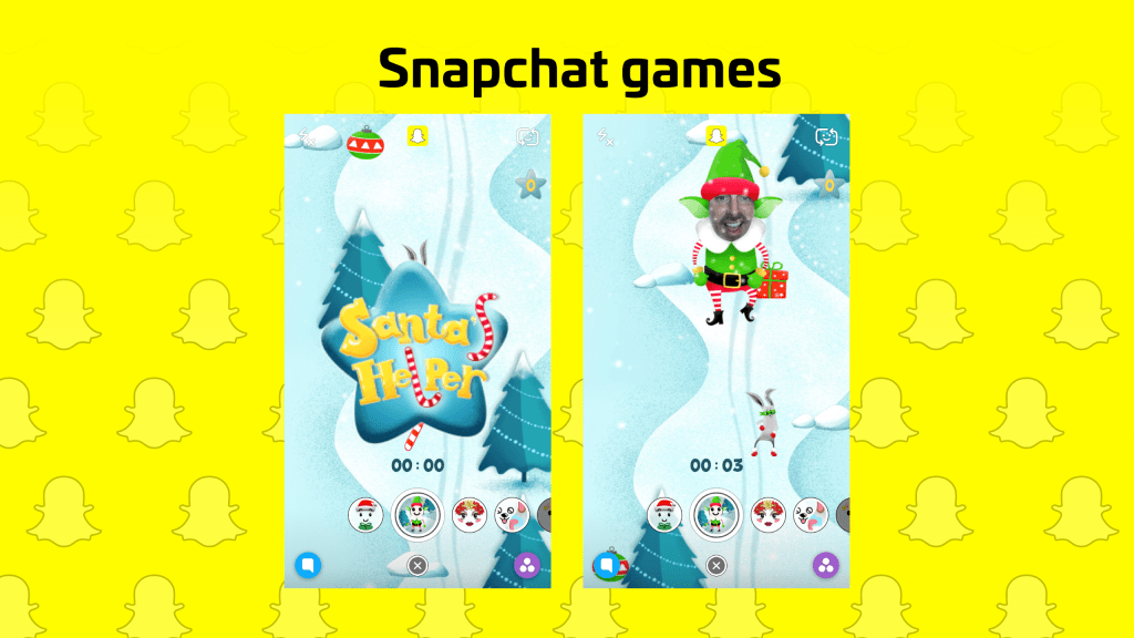 Now Snapchat is offering its most full-fledged, well-produced native game, called Santa’s Helper. It’s embedded in one of the first Lenses shown today. You can find it by opening the camera, holding on your face to scan it, then choosing the Santa’s Helper Lens.