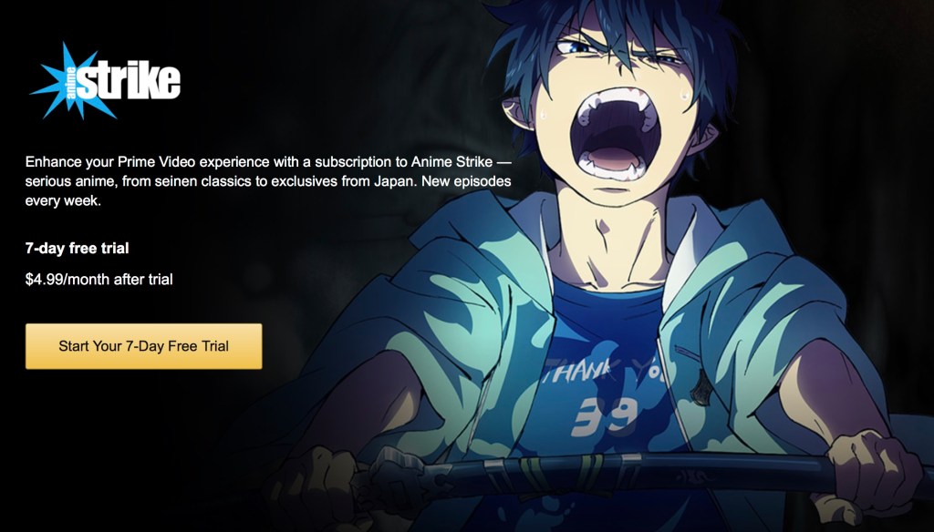Amazon will be doing more of this kind of tailored offering, Variety reports, but for now Anime Strike is the only Amazon-created selection available to Prime members in the U.S. via Amazon Channels. The subscription offering will run $4.99 per month, with an initial seven-day free trial, and includes no ads, along with a hefty library of anime hits, including day-and-date broadcast releases from ongoing series’ including “Scum’s Wish” and “Blue Exorcist: Kyoto Saga.”
