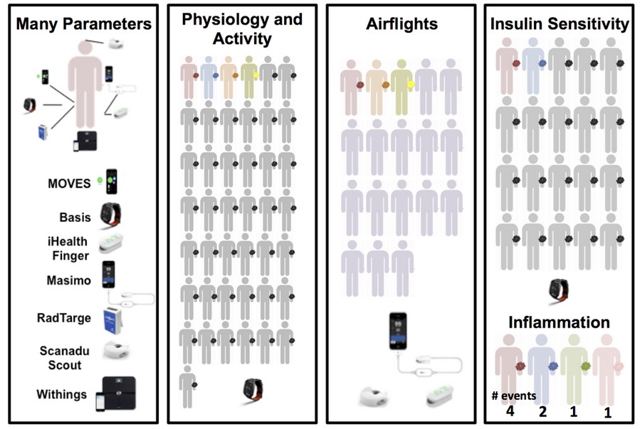 For instance, during air travel, people tended to show lower blood oxygen levels, resulting in fatigue. The onset of Lyme disease was able to be tracked, and individuals’ sensitivity to insulin (and thus risk for type 2 diabetes) was also evident from the physiological measurements.
