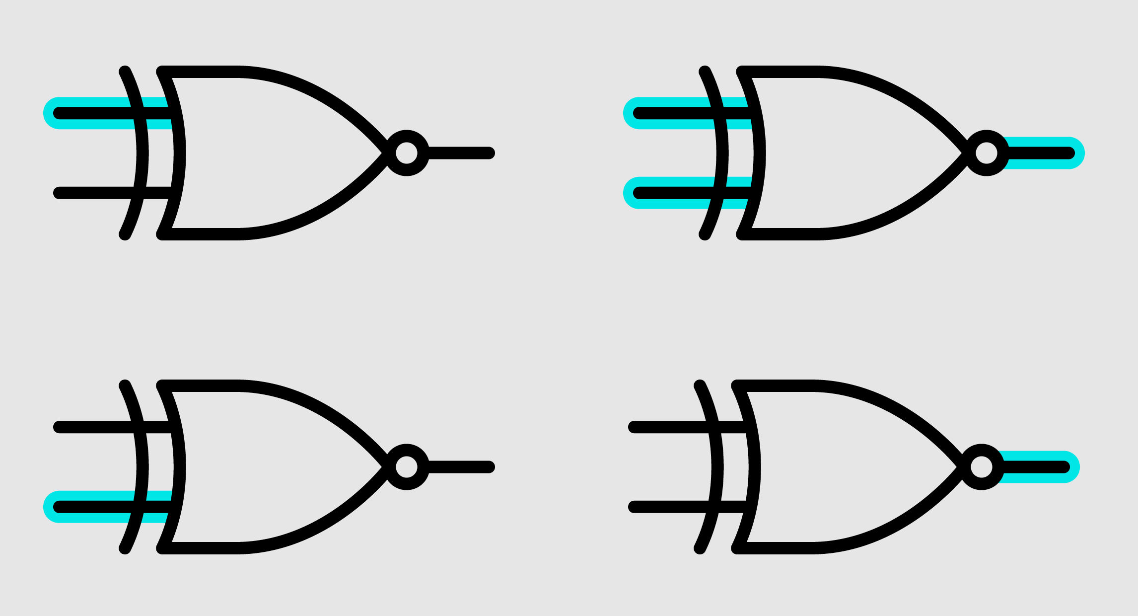 But chips do have some built-in capabilities, notably a set of simple operations known as logic gates. One gate might take an input, 1 (at this scale, it’s not actually a number but a voltage), and output a 0, or vice versa. That would be a simple NOT gate, also known as an inverter. Or of two inputs, if either is a 1, it outputs a 1 — but if neither or both is a 1, it outputs a 0. That’s an XOR gate.