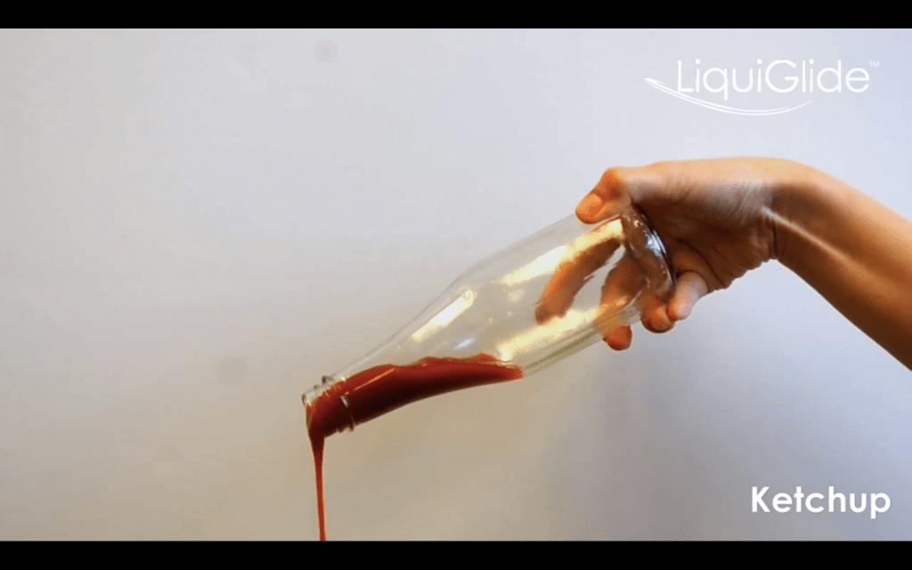 LiquiGlide’s proprietary formula consists of flavorless, odorless and already FDA-approved ingredients, Smith said. The coating does not interfere with recycling. The CEO said, “Eliminating the need to wash out a container improves the chances that someone will recycle it. And clean materials are easier to recycle, so we can improve the sustainability of packaging overall.”