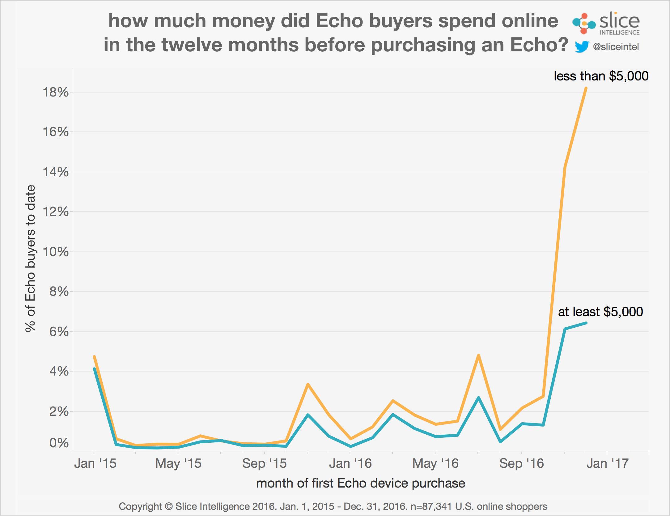 Slice also found that regular ecommerce shoppers made up a huge percentage of early Echo buyers, but that now first-time Echo buyers are not necessarily heavy online shoppers, which is also in keeping with more mainstream spending habits.