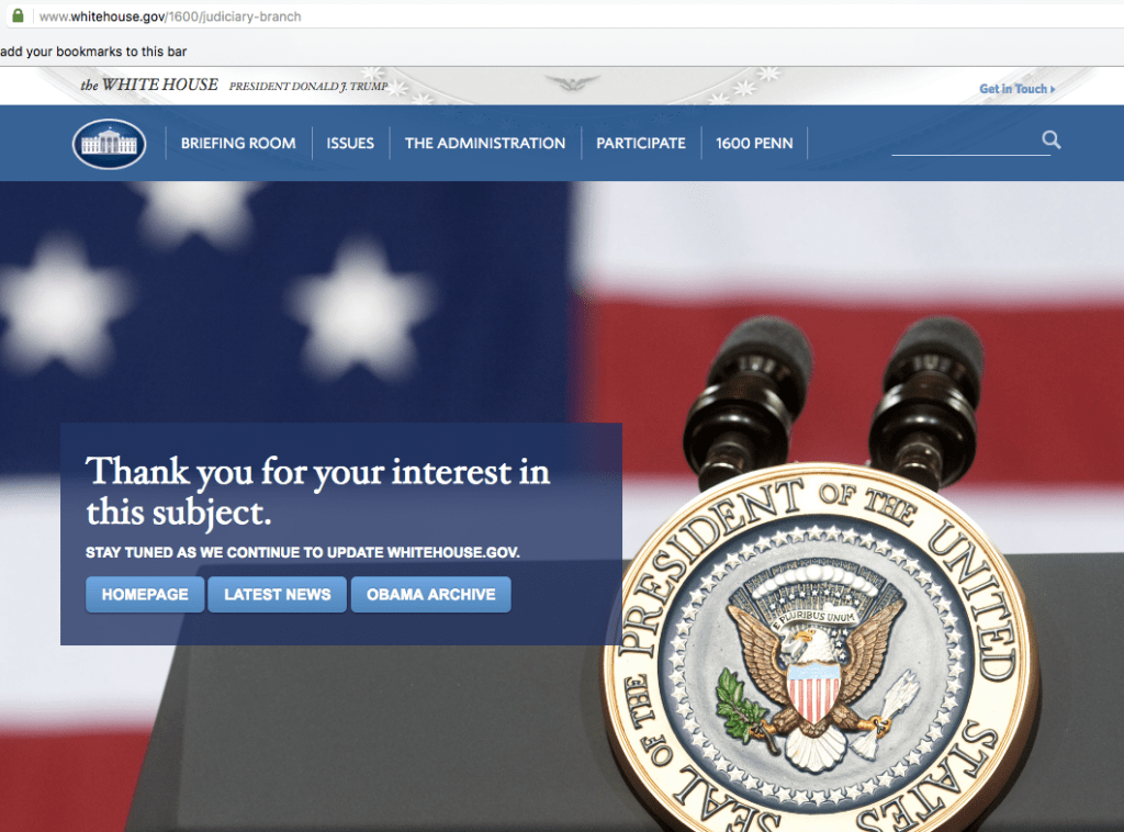 A generous interpretation of the missing Judicial Branch page is that the administration is holding off in order to include the president’s pick for the Supreme Court on the page. Less generous interpretations for the removal of a link to the only independent branch of government are available.