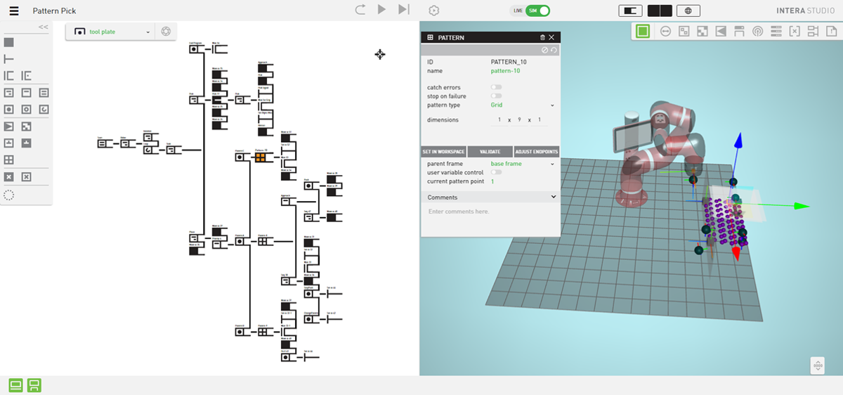 It’s a relatively simple behavior tree system with a bright, straightforward GUI and instructions. If this, then that: scan, move, pick up, put down, softly, quickly. And because the robot uses computer vision, you don’t have to make sure every part or bucket is where it needs to be with millimeter precision. It also can be programmed from the desktop with a similarly visual UI.