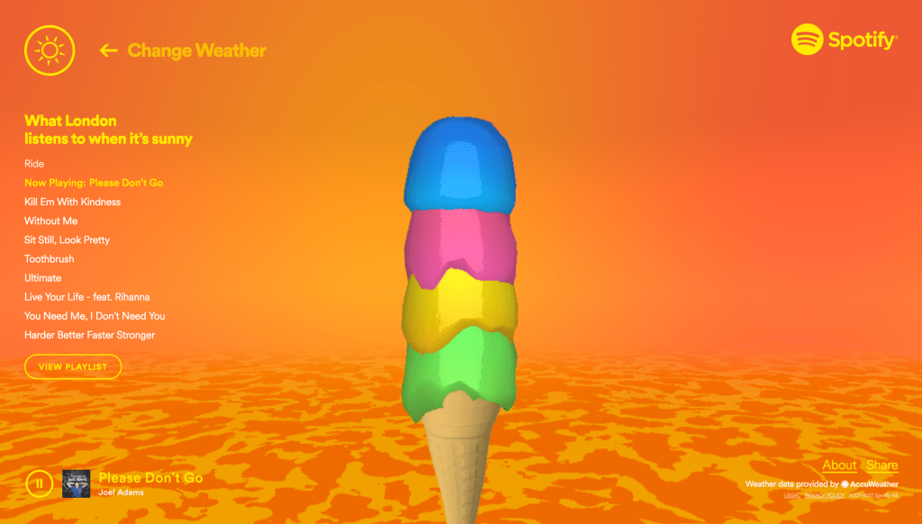 Climatune is a little different: Spotify has created a distinct website, which detects your location (or closest location that it’s tracking) and then presents you with a playlist of 30 tracks to fit the weather.