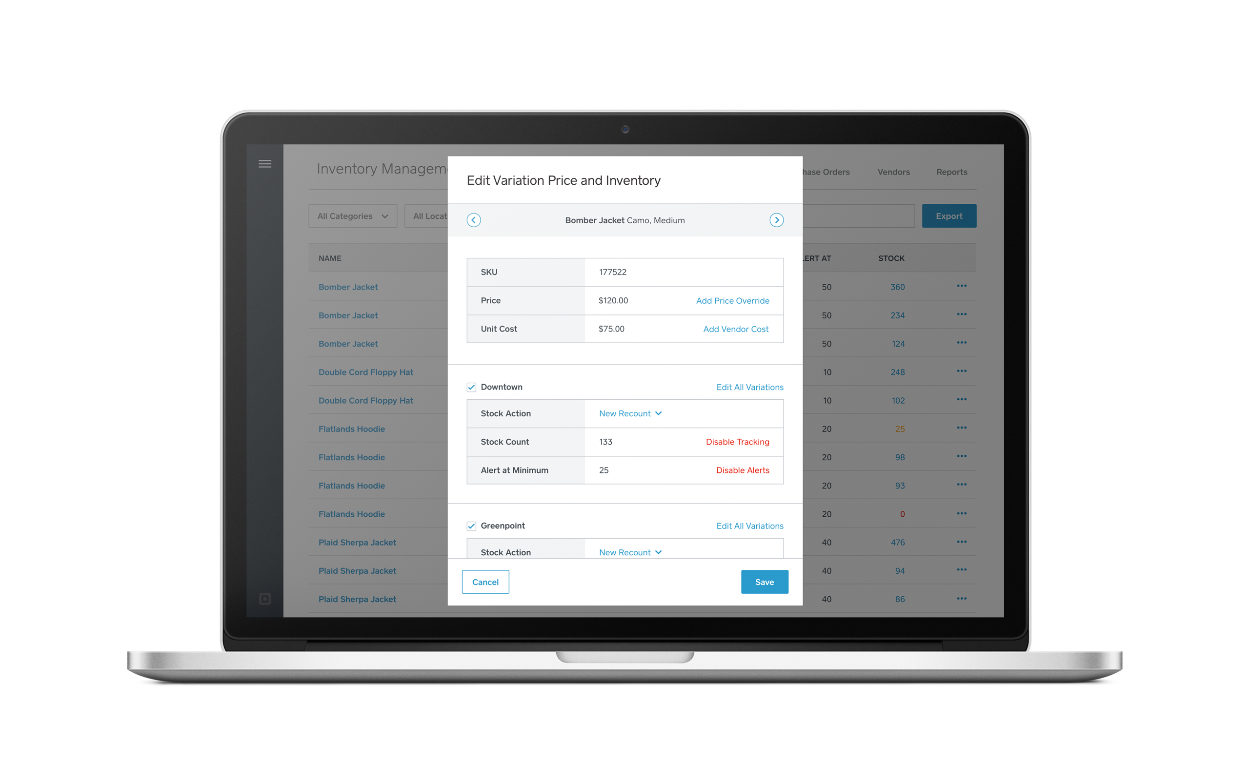 Inventory management is similarly slick, with real-time unit counts that scale across locations, if a shop owner has more than one. This system also allows you to request transfer of units from one location to another, and it makes ingest easy by letting you input and track your purchasing orders, including marking shipments as received to automatically load those new items into your inventory.