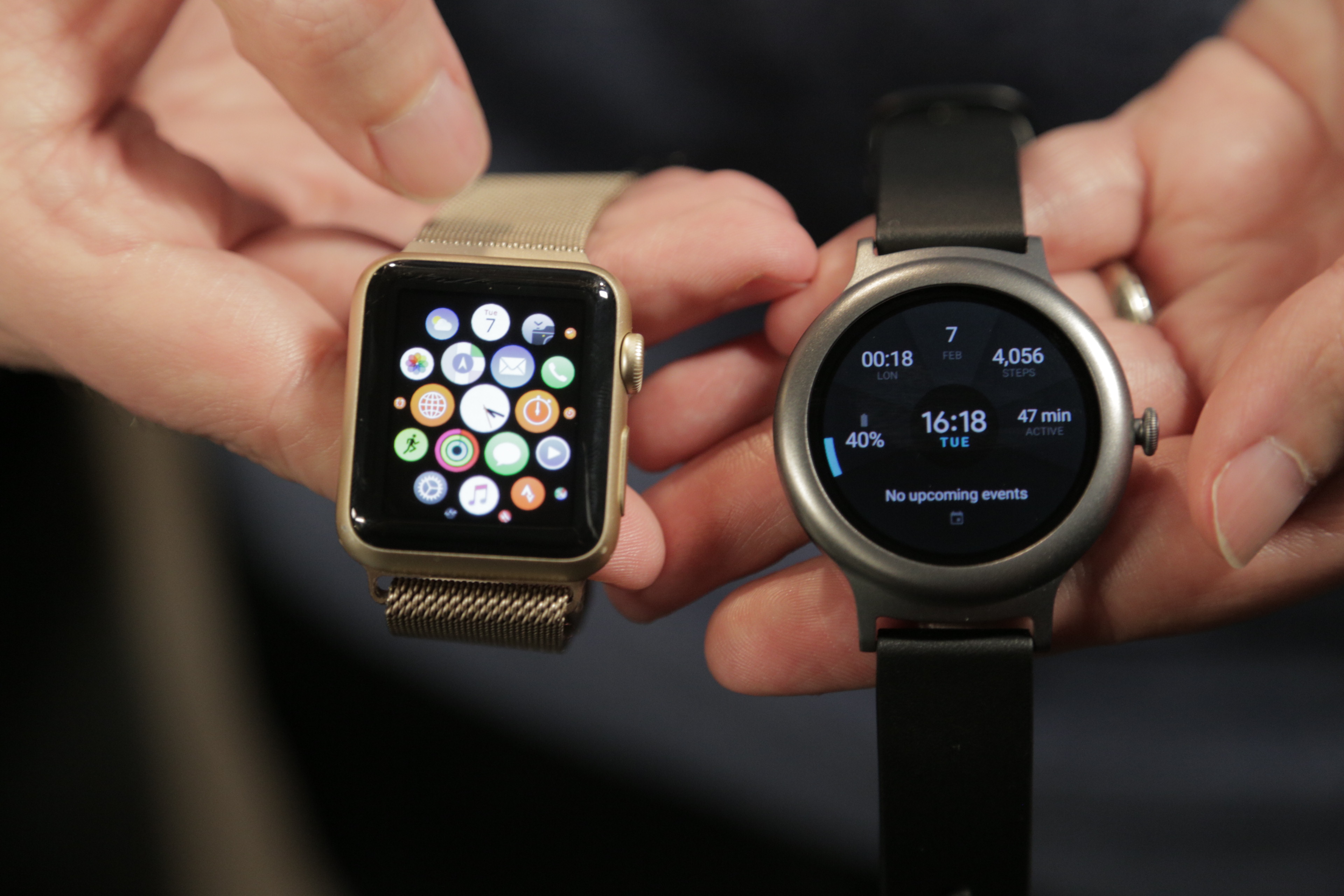 The Style, on the other hand, is what you get when you pare down Wear 2.0 to its absolute basics. It’s a perfectly stylish round smartwatch that comes with a bunch of different color options both for its bezel and its bands. Its design definitely takes its cues from the earlier LG Watch Urbane line and is also a bit reminiscent of the Fossil Q. It’s 14.2 mm thick, and that’s a good 3 mm thicker than an Apple Watch. Thanks to its tapered edges, the size feels alright, though.
