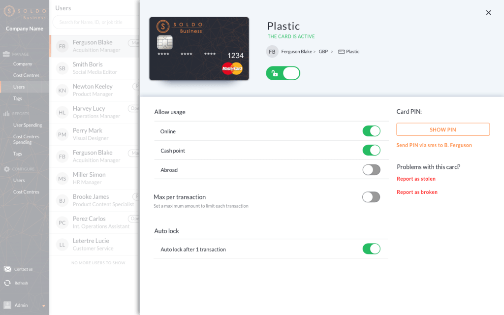 For example, cash limits can be set and companies can choose to block online payments, cashpoint withdrawals and foreign transactions.
