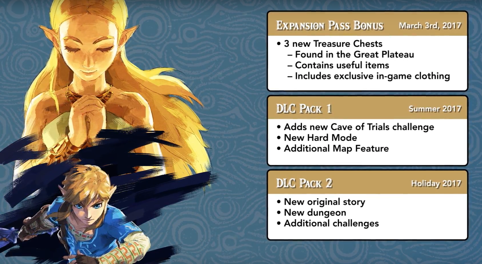 First, on March 3 (Switch and Breath of the Wild releases day) you get bonus treasure chests and exclusive in-game clothes for Link. Then in the summer, there’s a new Cave of Trials challenge, a new Hard difficulty mode for gameplay and another new “map feature.” Then in time for holidays, there’s a brand new original story content add-on, with a new dungeon and more new challenges.