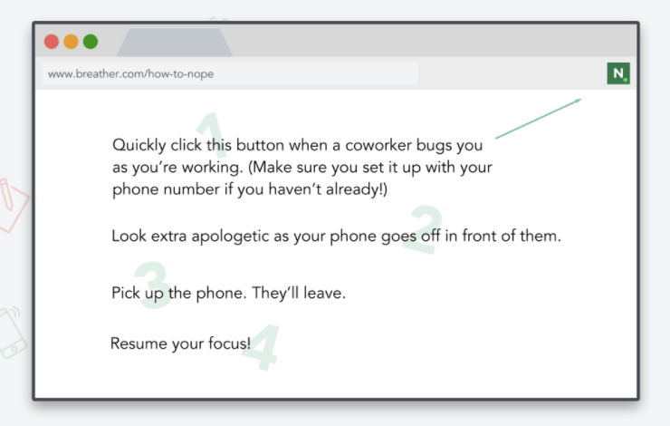 Users can install the Nope Button as a Chrome plug-in, which will in turn ask for the user’s cell phone number. After that, a big Nope button will display right in their browser. When someone from the office approaches with a new task or distraction, users can simply press the Nope button.