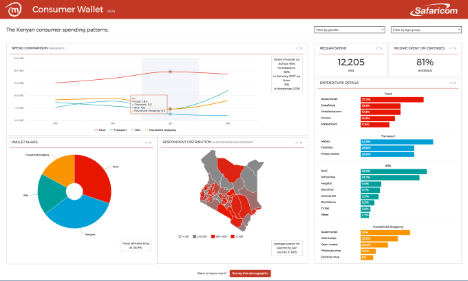 For the Consumer Wallet beta test, mSurvey will use daily SMS and text messages to track the cash-based spending of a 1,000-person sample drawn from Safaricom mobile subscribers. This will feed into the Consumer Wallet database tracking preferences and expenditures on items such as food, transport, education and housing.